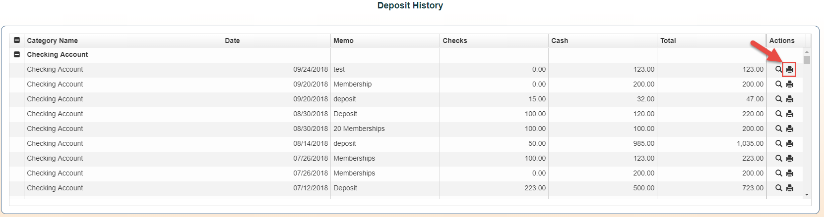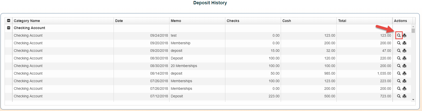 1.To View the Deposit on the screen select the Magnifying Glass icon next to the deposit date you wish to view