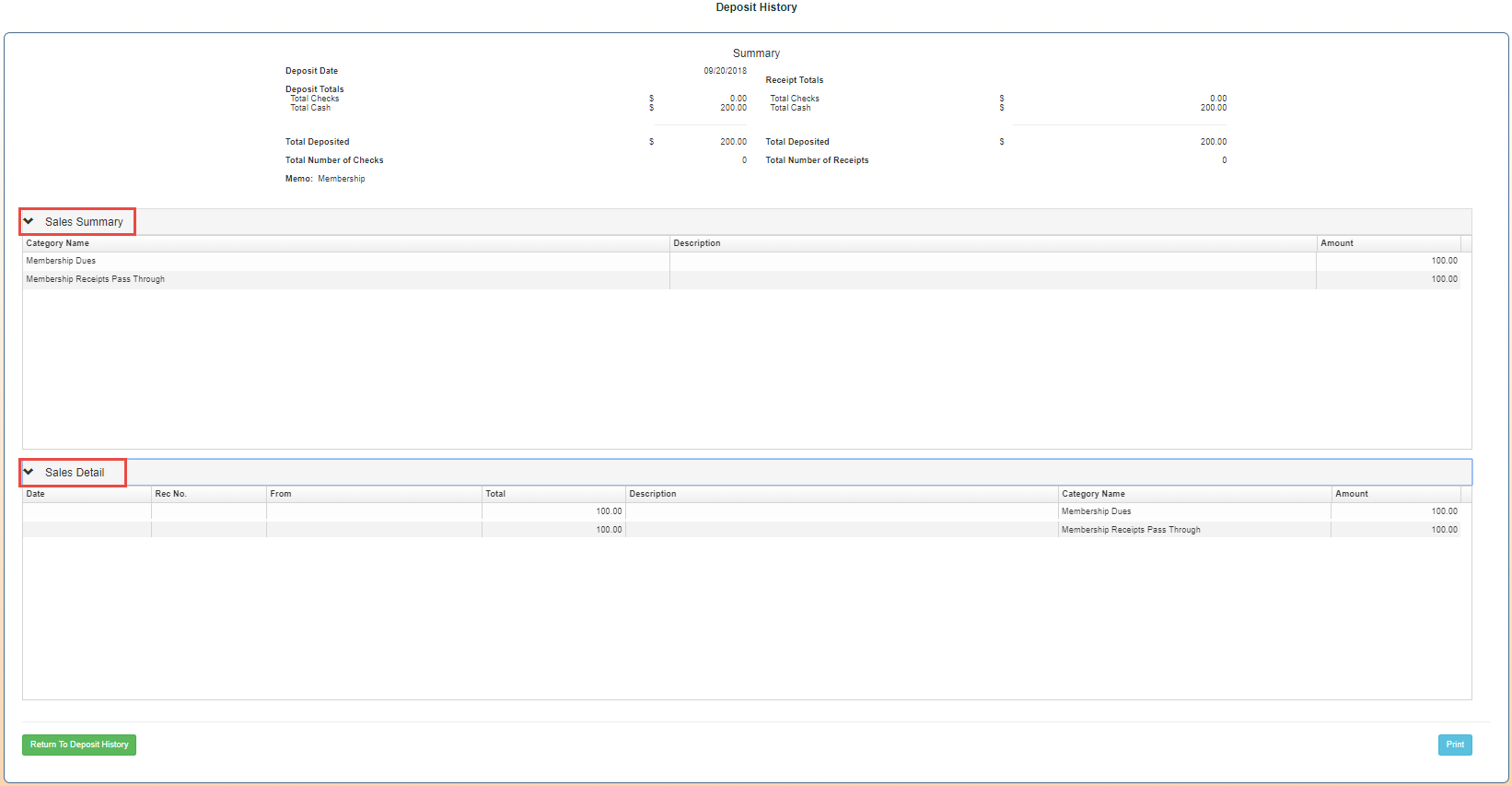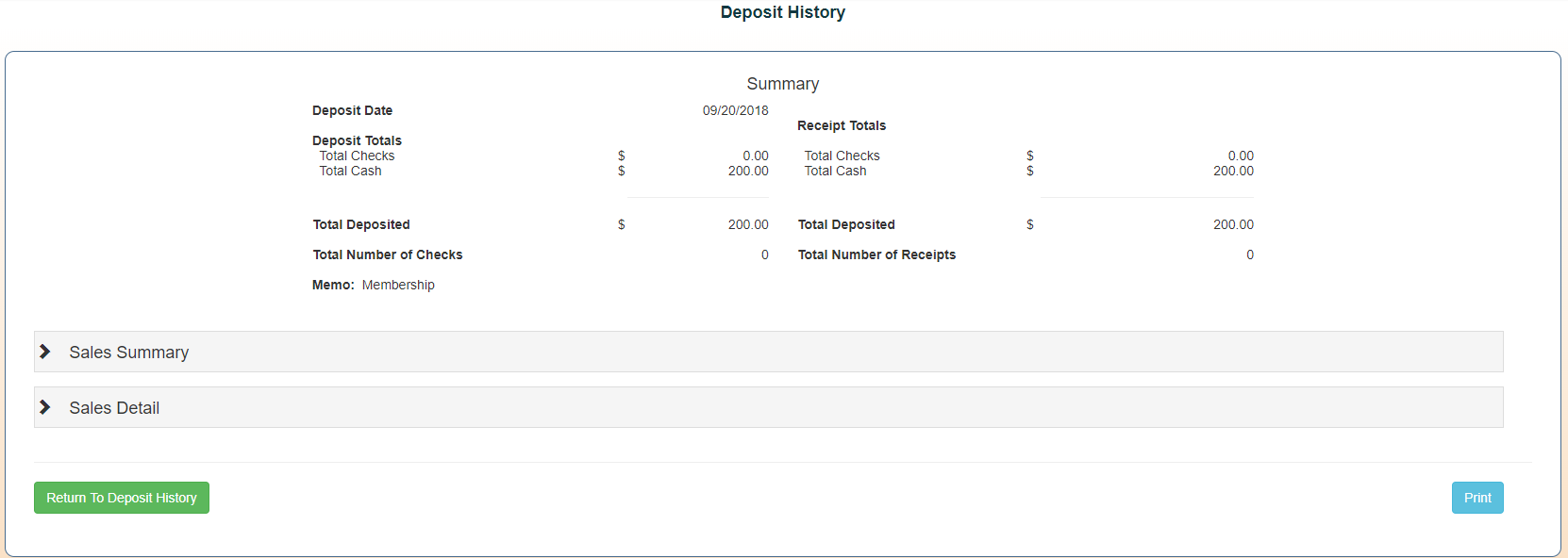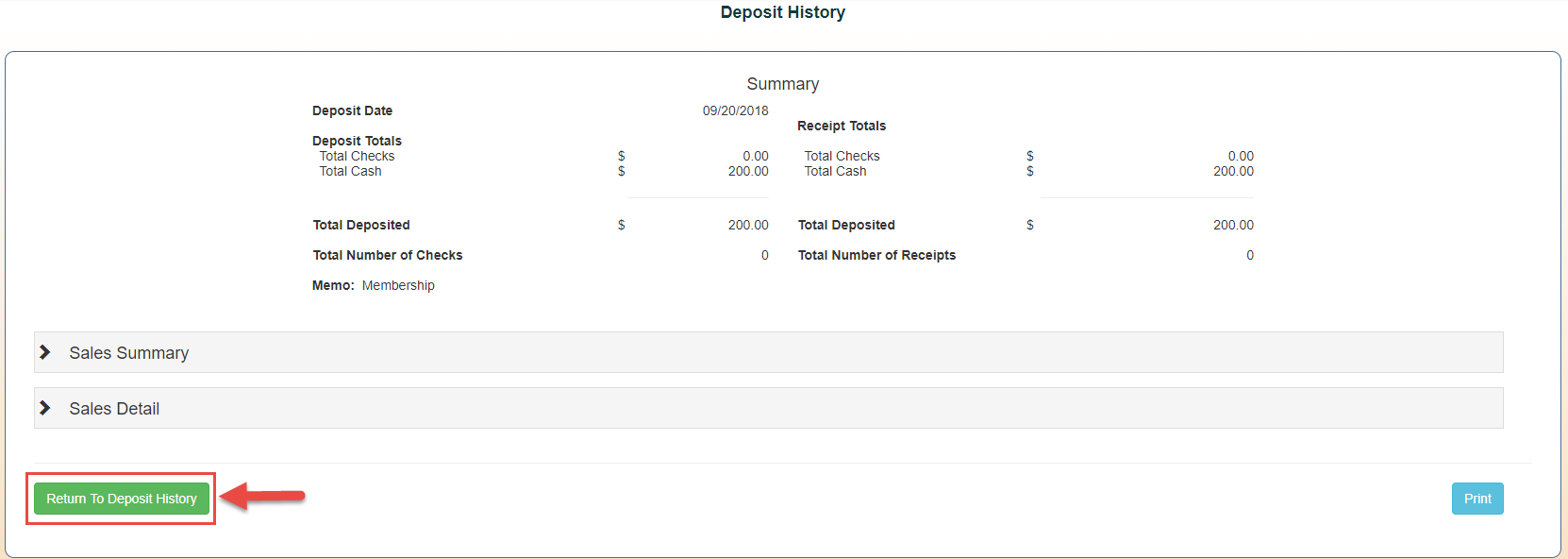 1.To Return to the main Deposit History screen, click the Return to Deposit History button on the bottom left of the screen