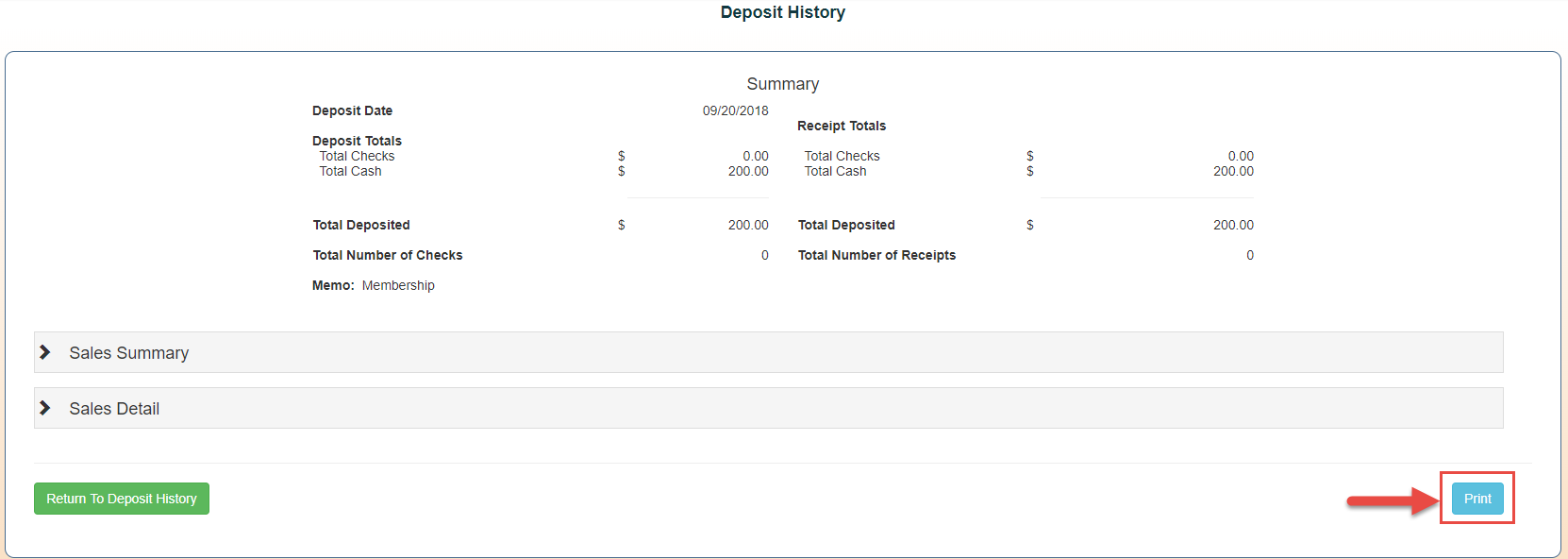 1.To generate a deposit history report, click on the Print button at the bottom right of the screen, or on the Main Deposit History page select the Printer icon next to the Deposit Date