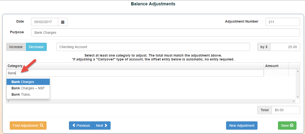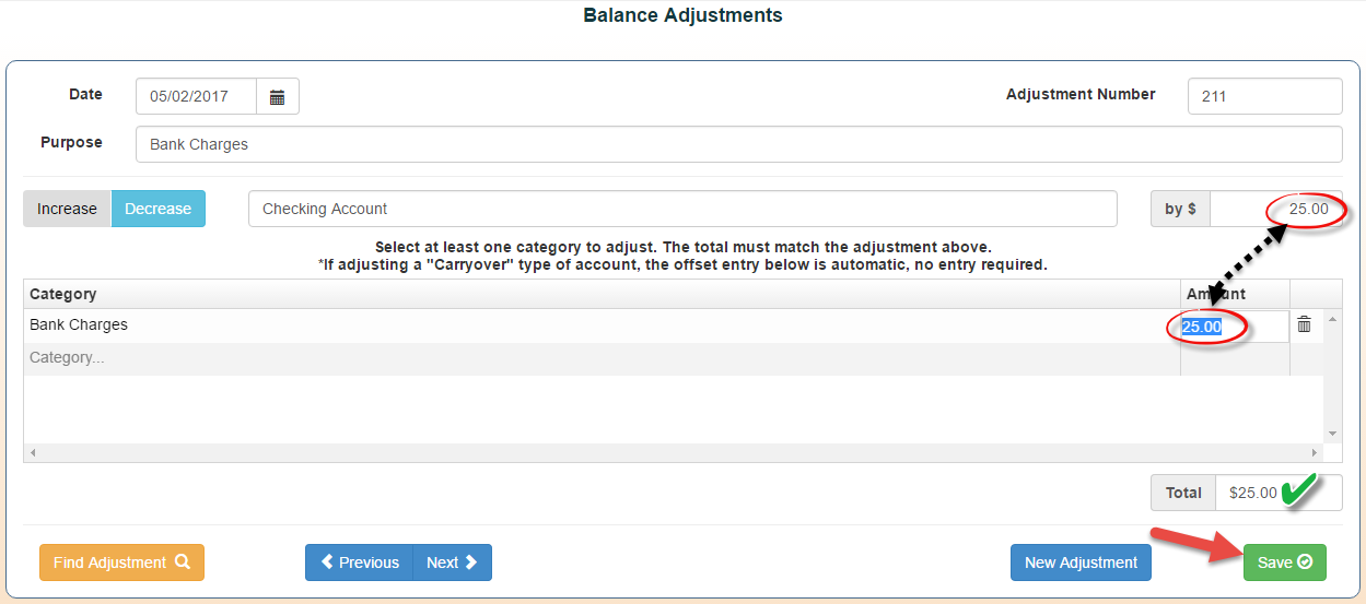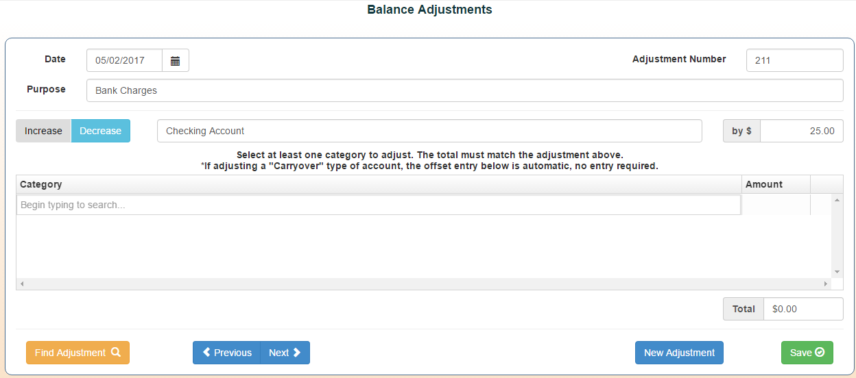 Balance Adjustments are used to move money from one category to another and well as account for any bank charges, including NSF checks as well as interest earned.