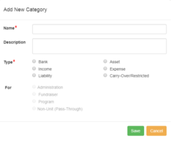 To add a new category, select "Add New Category". You will then enter the Category Name, Description and Association (what it is “For”).