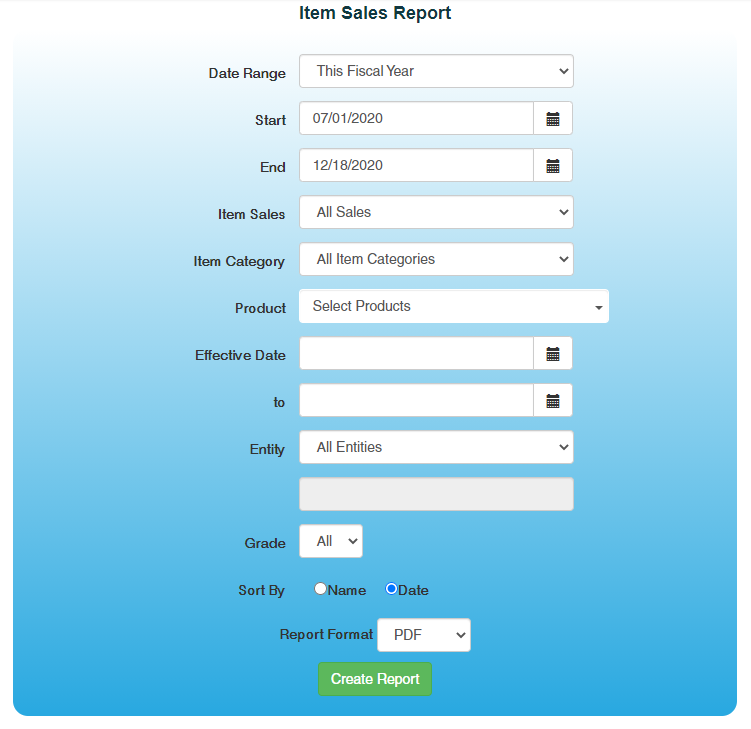 1.Select Reports > Item-Sales Reports > Item Sales from the report menu