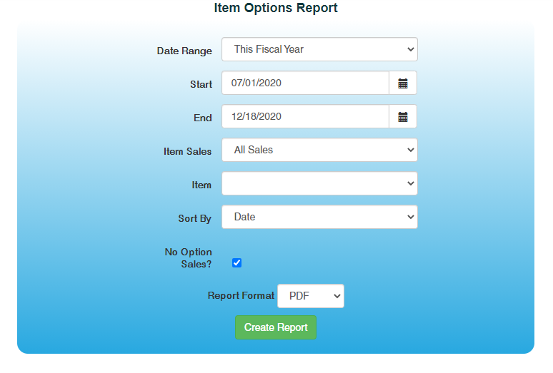 1.Select Reports > Item-Sales Reports > Item Options from the report menu