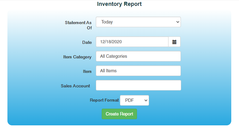 1.Select Reports > Item-Sales Reports > Inventory Report from the report menu