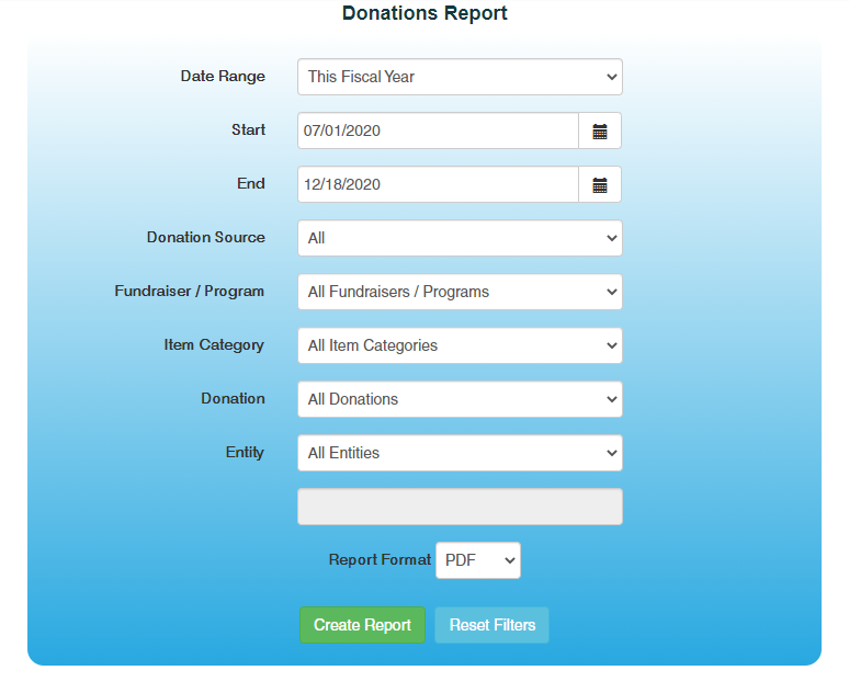 1.Select Reports/Item-Sales Reports/Donations Report from the report menu