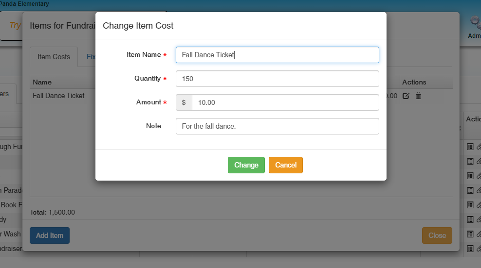 2.This will open the Items box, where you can add, remove or change items that you want to sell or purchase for the fundraiser