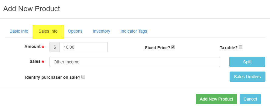 5. Select "Sales Info" and complete the required fields. You can also split categories by selecting the green arrows