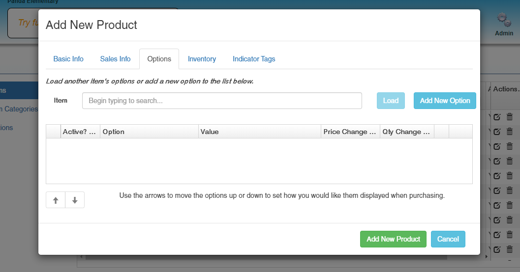 6. Select the "Options" tab. This is where you can apply the options you previously created to your new item. You can also load the options of a previous item by selecting the item and clicking "Load". You can move options around to set them in the order you You can add all values from Selection List options at once by selecting the "Add All Values" button.