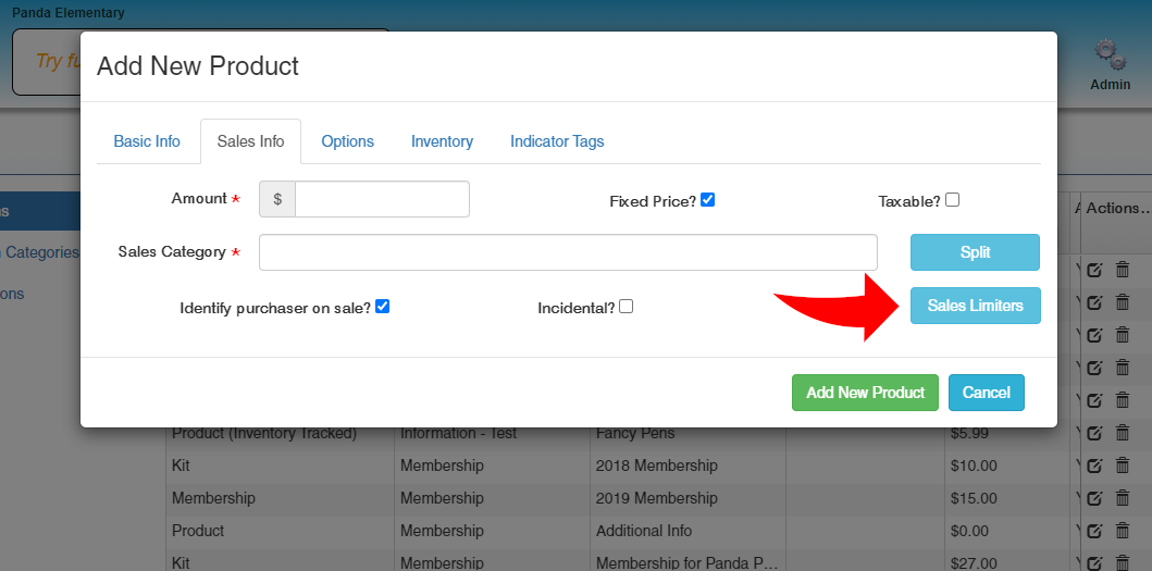 Sales Limiters can be applied to items that can limit the quantity a purchaser can buy at one time. To use limiters, you cannot have the “Identify Purchaser on Sale” box checked, purchasers must be logged into their Web Store account in order to purchase an item with limiters.