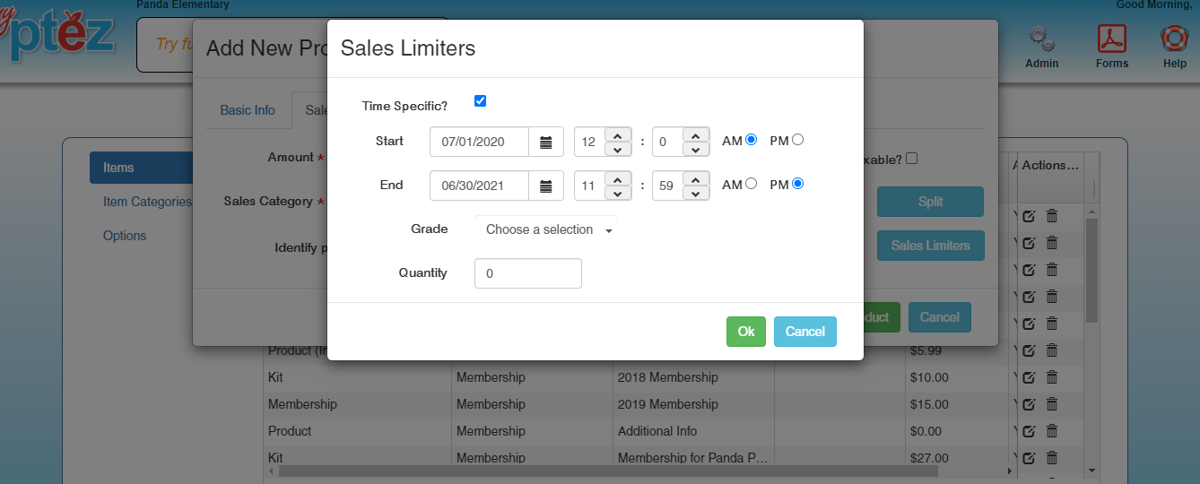 Time Specific Limiting for item Sales on your Web Store. You can select a specific time period you would like an item to show on your Web Store. Using this option will make it so that this item will not appear on your Web Store until the start date and time and then will disappear from your Web Store as of the end date and time.