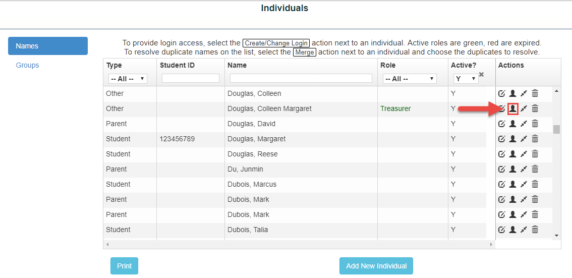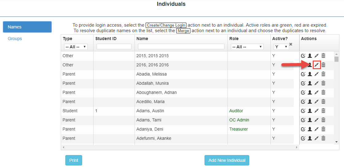 1.Choose the “Merge Icon” from the Action Tools column on the line of the individual you would like to keep.