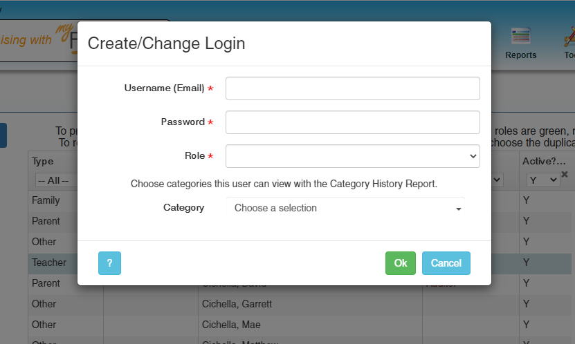 To give access to a user select Person icon (Create/Change Login) in the Action Tools. This allows you to assign positions to other individuals and give them access to view selected accounts