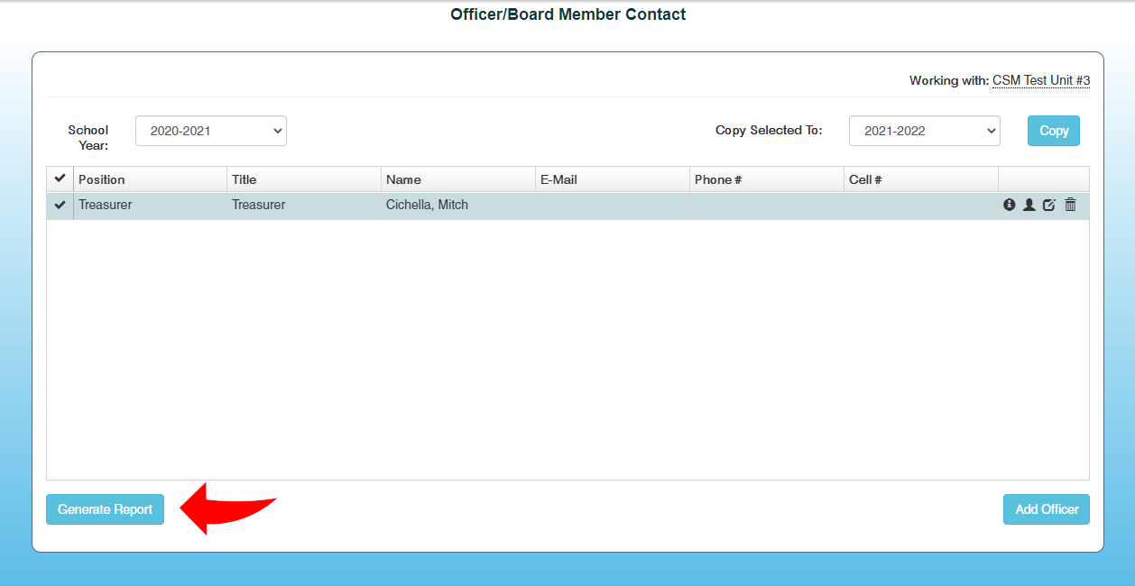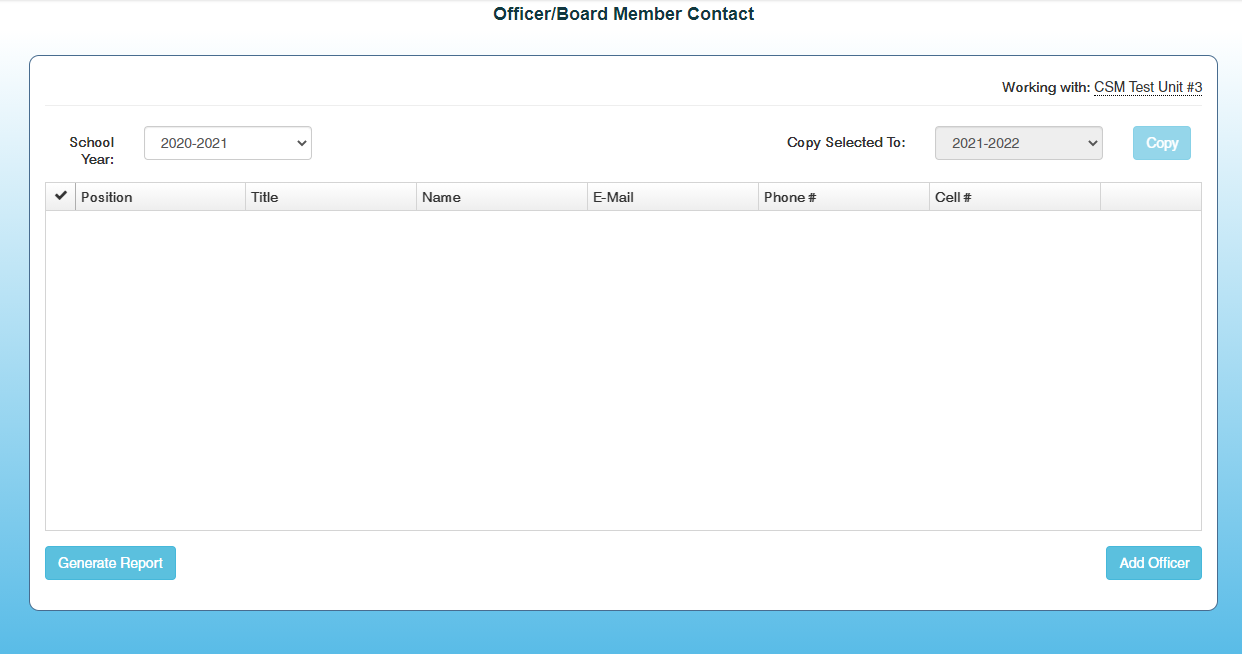 3.Once inside Officer/Board Member Contact your screen will default to the Officers List for the Current School Year: