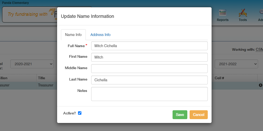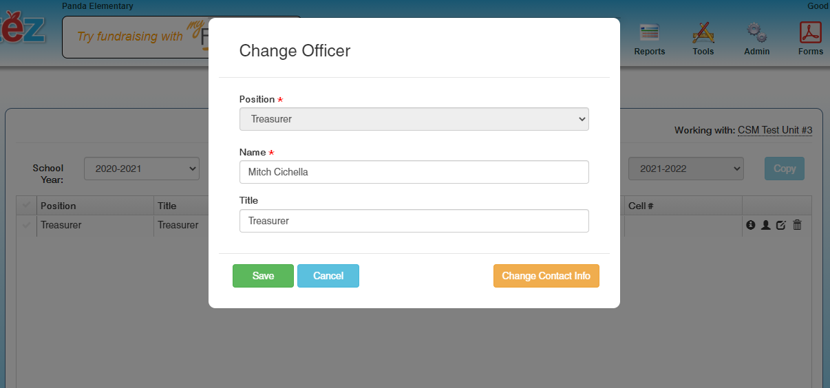 Certain “Positions” once they have been added (i.e., President/Treasurer) cannot be used twice by multiple individuals during the same year. If an incorrect individual was assigned to a “Position”, you will need to change the “Name” of the person: