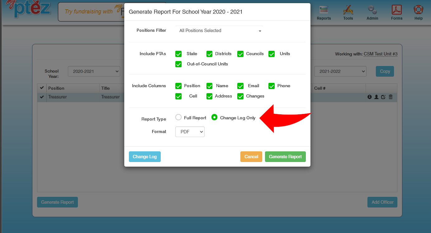 8. To run a report for just changes, select “Change Log Only” as the Report Type
