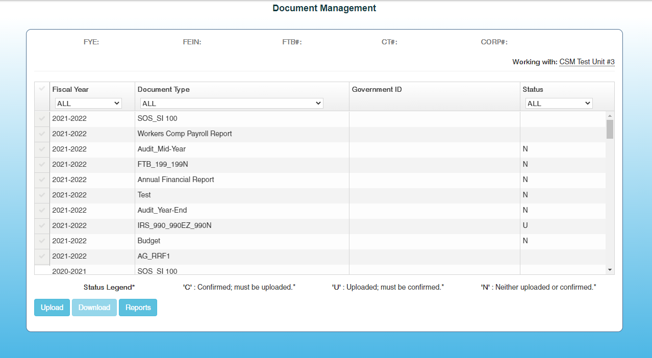 3.Once you are on the correct Document Management Screen for the correct organization, select “Upload” on the bottom of the screen.