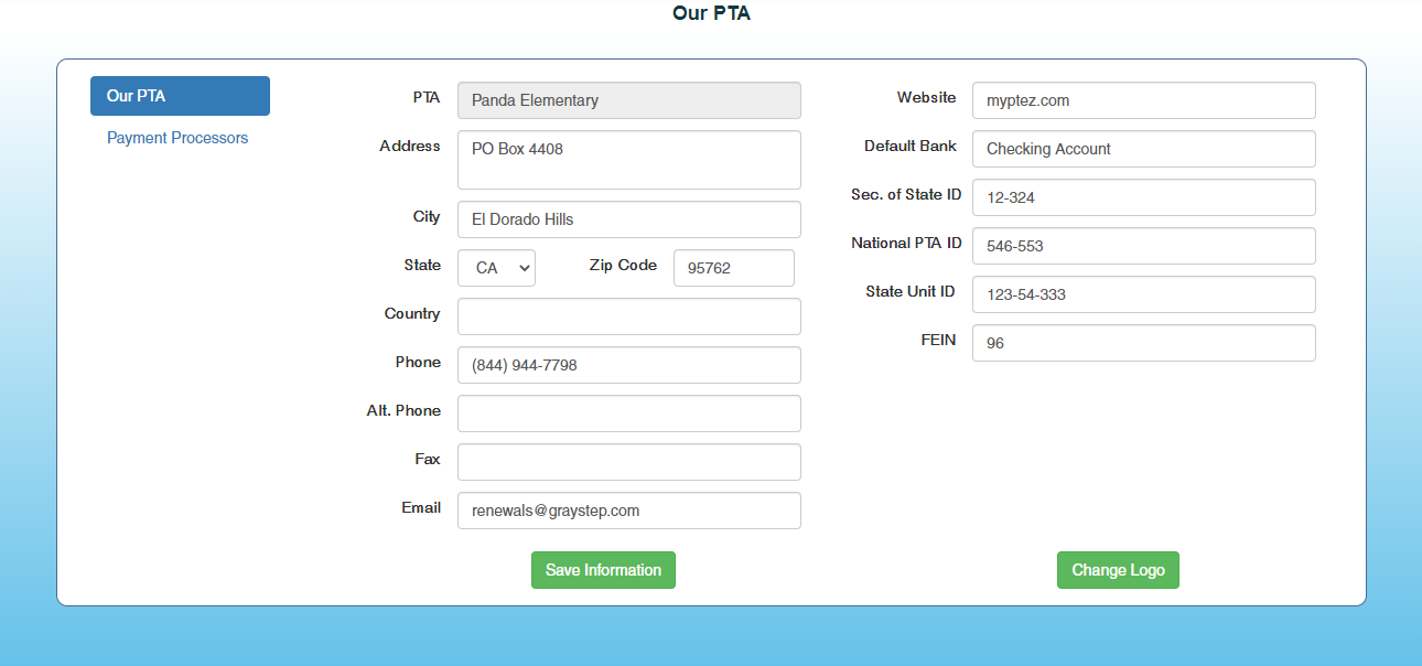 *Note: For Units in California, your EIN will automatically be set - DO NOT CHANGE THIS NUMBER without confirming your correct FEIN with the California State PTA.