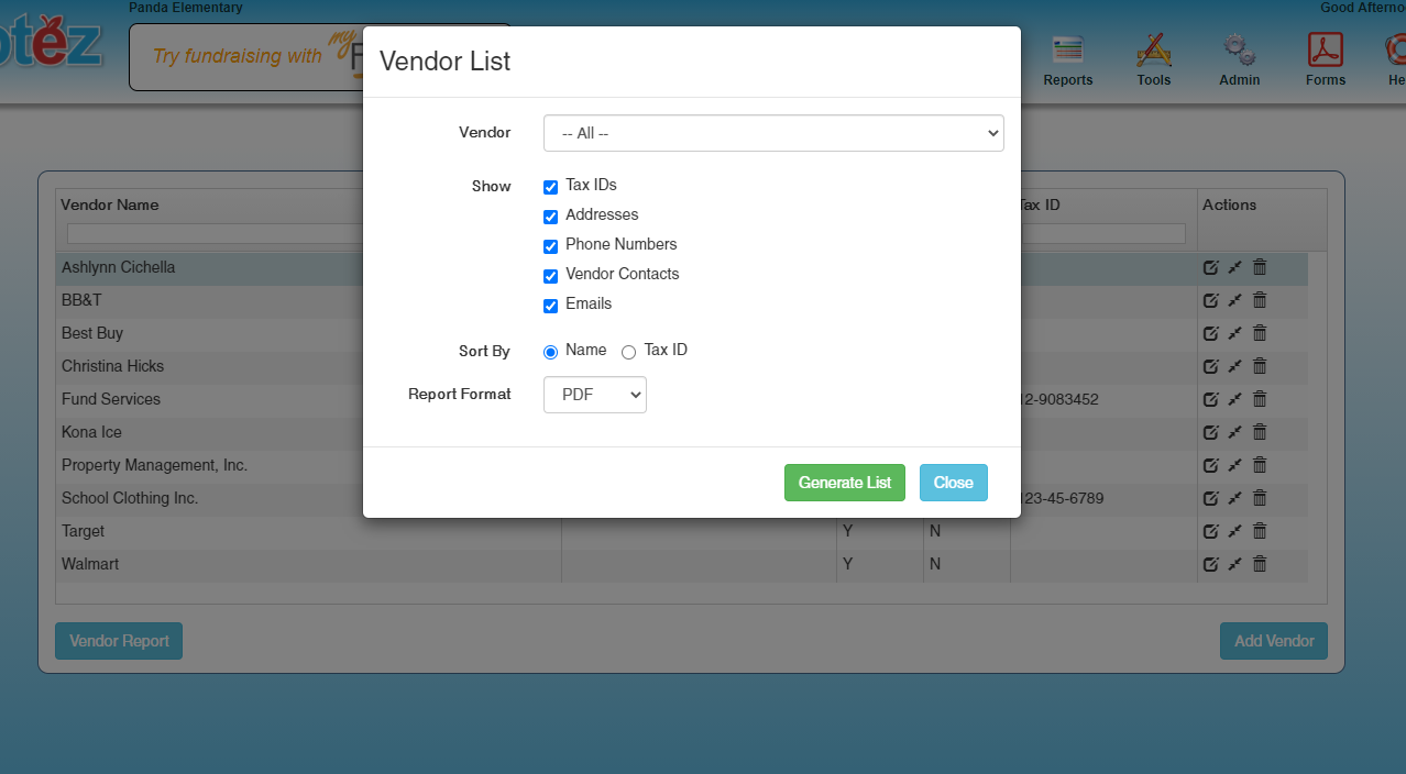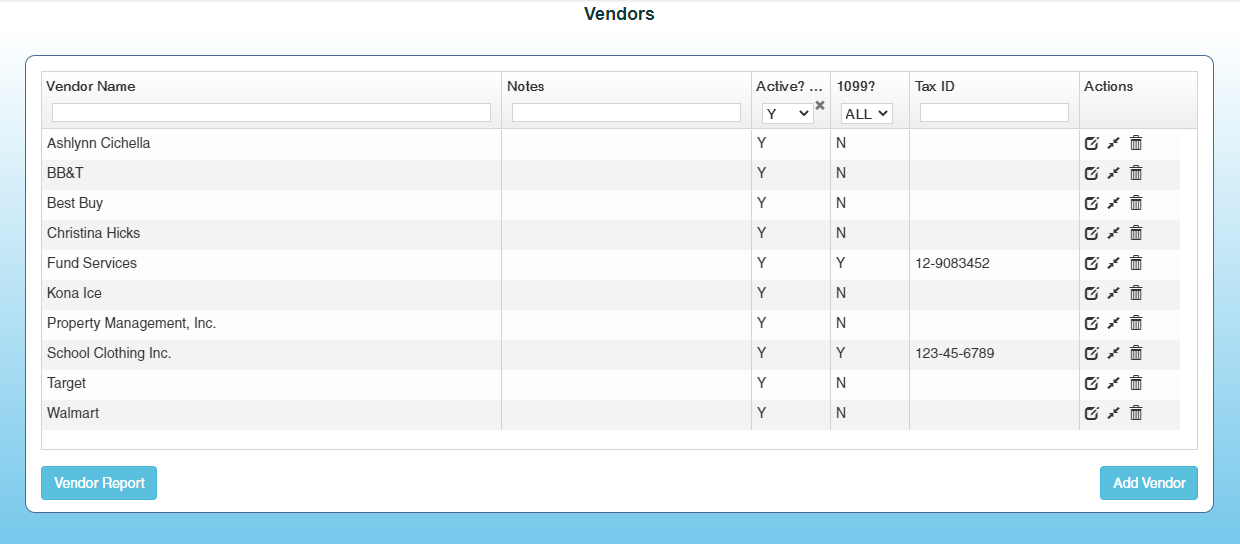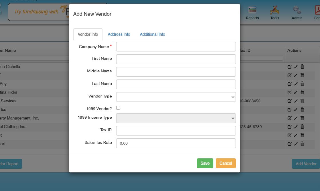 Vendors are persons or organizations that sell goods or services to another person or organization. The list we wish to create here is a list of Vendors that the PTA organization is purchasing from. This list of Vendors will assist the user in recognizing which one of their vendors are 1099 vendors as well as holding information pertaining to the vendors such as their contact information. Please note that not all vendors are needed to be added at this time. While using certain applications such as the write check application to write a check, when making a check out to a new vendor that is not already on your list, the software will prompt the user to complete a quick add of the vendor. By completing the quick add the vendor will be added to the users Vendor list. However, if the user wishes to add contact information for that vendor you will need to go into vendor admin and edit the vendor, instructions are below.