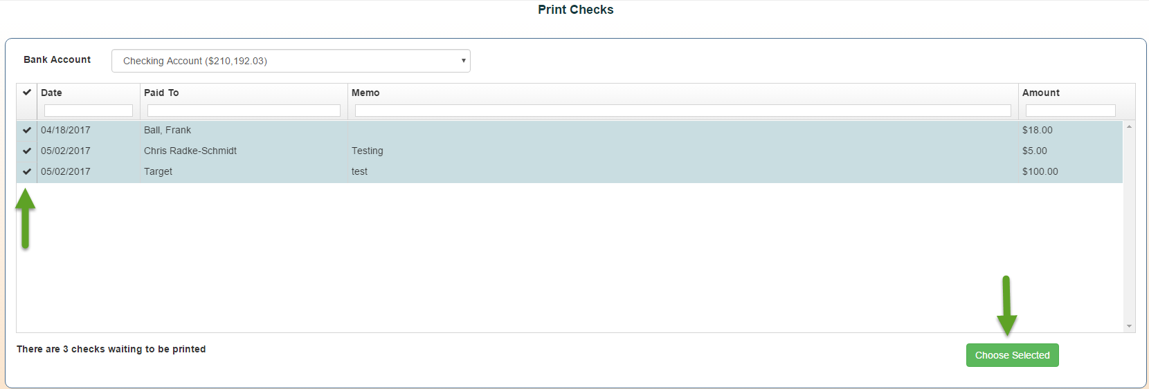 1. Select the check(s) you will be printing. Click “chose selected”