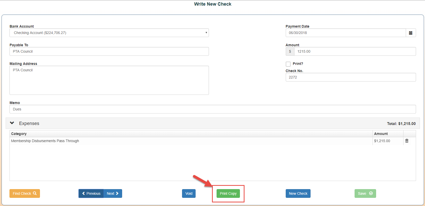 3. Once on the Check, select the Print Copy