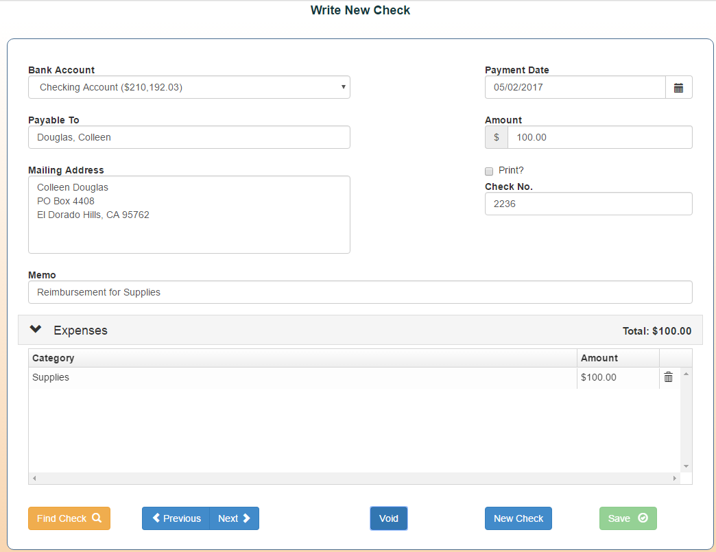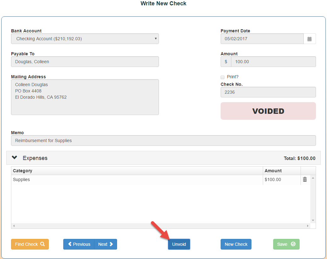 *Note: If you are voiding a check that was entered in to the system during the Setup Process, you will need to first change the Expense Category of the check to the correct category (all checks entered in during Setup are automatically expensed to Fund Balance), and then void the check. If you do not change the Expense Category, the voided check will show as a "Change to Fund Balance".